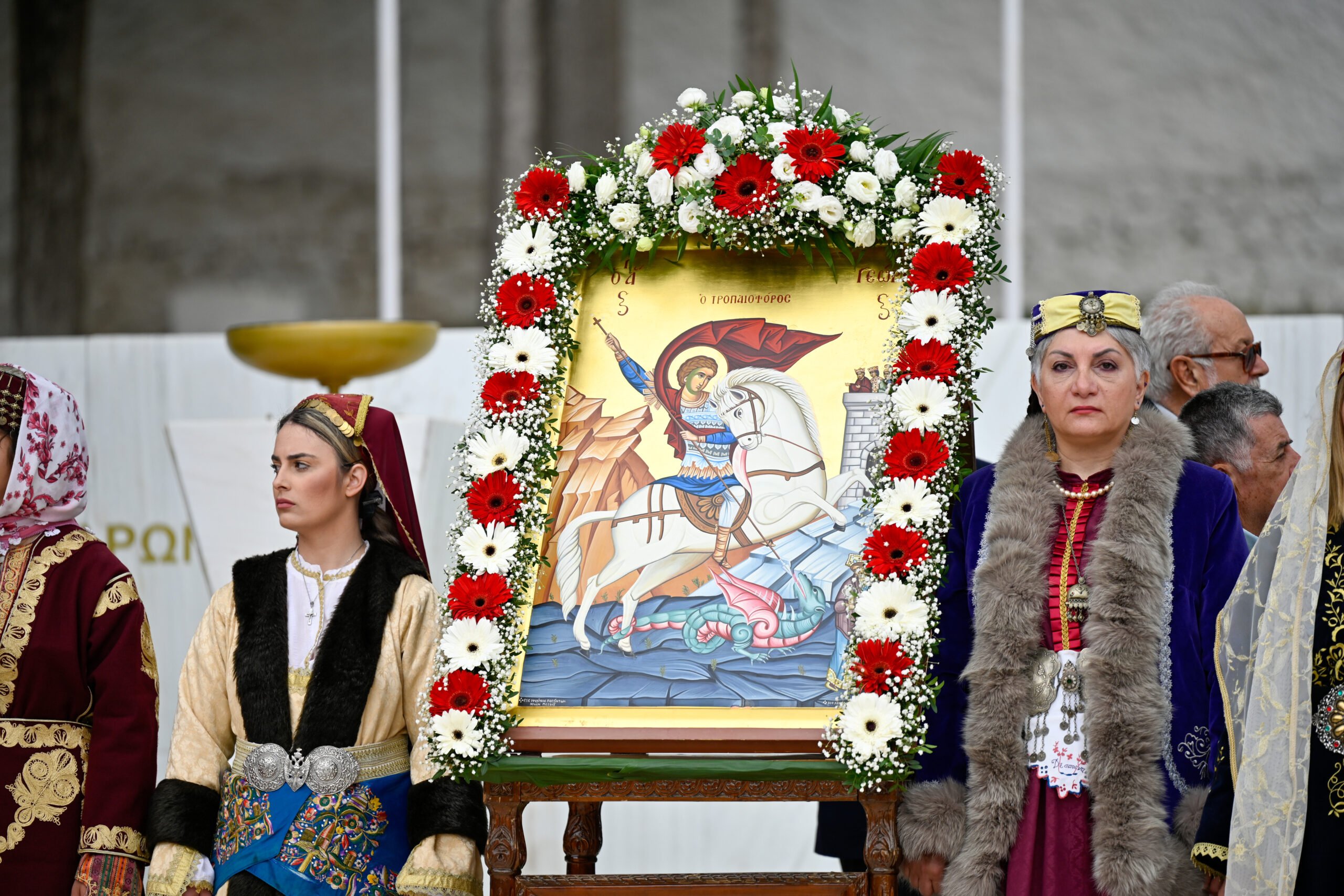On Friday 10 May 2024, in the presence of the Minister of National Defence Mr Nikos Dendias, as representative of the President of the Hellenic Government, and in the presence of the Chief of the Hellenic Army General Staff Lieutenant General Georgios Kostidis, who represented the Chief of the Hellenic National Defence General Staff General Dimitrios Choupis, the celebration ceremony for the Great Martyr Saint George, Patron Saint of the Army, took place in the premises of the Infantry School at the “Major (INF) VELISSARIOS IOANNIS” Camp, in Chalkida.