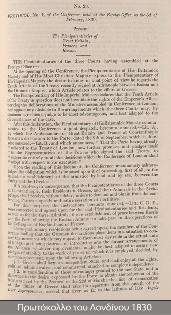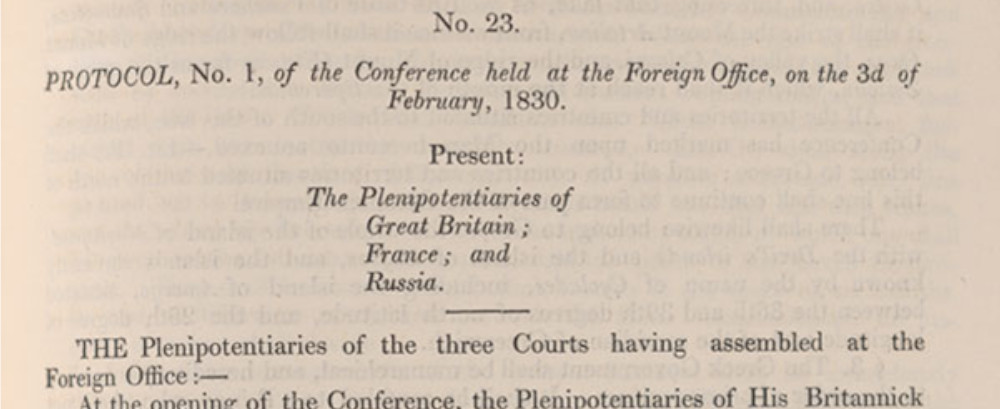 The London Protocol was an important international treaty that was concluded on 3 February 1830 between the three Great Powers of that time: Great Britain, France and Russia. This treaty involved the establishment and the international recognition of the new independent Greek state. Moreover, the borders of the newly established Greek state had been defined, with the inclusion of Peloponnese, Central Greece and the Cyclades in its territory. At first, the Great Powers sought Greece’s autonomy under the Ottoman suzerainty, but the 1830 Protocol laid the foundations of the country’s full independence. It was also decided to establish monarchy under a foreign ruler. The signatories to the protocol initially selected Prince Leopold of Saxe – Coburg as monarch; however, he resigned on the grounds that the Great Powers did not satisfy his requests. Following Leopold’s refusal, Otto of Bavaria was nominated as the first king of Greece. The London Protocol was a major turning point in the history of Greece and the Greek nation, as it signalled the recognition of its sovereignty by the international community.