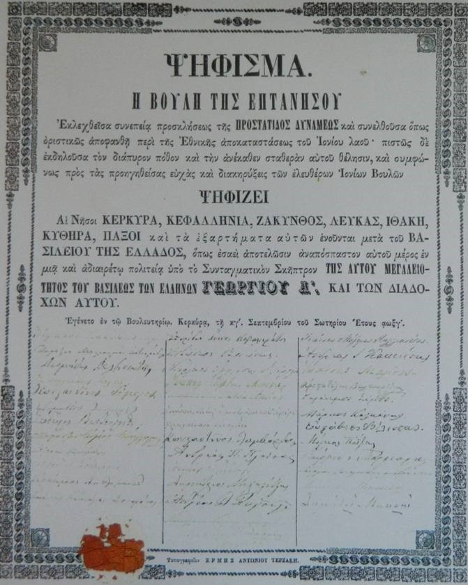 Η Ένωση της Επτανήσου με την Ελλάδα αποτελεί έναν από τους σημαντικότερους σταθμούς στην πορεία της εθνικής ολοκλήρωσης του νεοσύστατου ελληνικού κράτους.