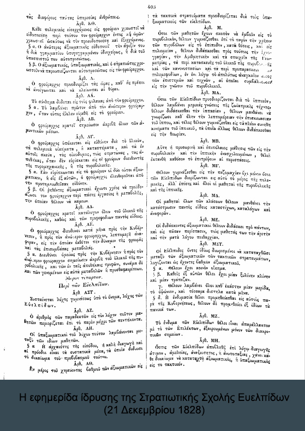Την 1η Ιουλίου 1828, με μοναδικό εκπαιδευτή τον Σαντινέλλι και με τους πέντε πρώτους μαθητές, οι οποίο λίγες μέρες αργότερα διπλασιάστηκαν, ο Καποδίστριας τους ονόμασε «Ευέλπιδας», τίτλος που διατηρείται μέχρι σήμερα.