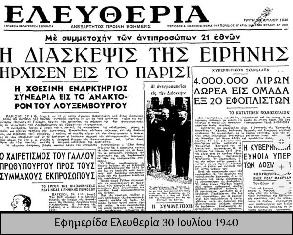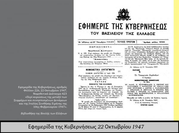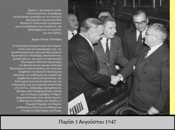 Η Συνδιάσκεψη Ειρήνης στο Παρίσι άρχισε τις εργασίες της στις 29 Ιουλίου 1946 και είχε πρωταρχικό στόχο τον καθορισμό διεθνών συνθηκών οι οποίες θα διευθετούσαν τις εκκρεμότητες μεταξύ νικητών και ηττημένων του Β΄ Π.Π. Στη διάσκεψη συμμετείχε και η Ελλάδα, στο πλευρό των νικητών, προβάλλοντας ζητήματα εδαφικών διεκδικήσεων και οικονομικών επανορθώσεων. Επικεφαλής της πολυμελούς ελληνικής αντιπροσωπείας ήταν ο ίδιος ο πρωθυπουργός και υπουργός εξωτερικών Κωνσταντίνος Τσαλδάρης. Οι συμφωνίες που επιτεύχθηκαν, υπογράφτηκαν μετά από μερικούς μήνες στη Συνθήκη Ειρήνης, την 10η Φεβρουαρίου 1947.