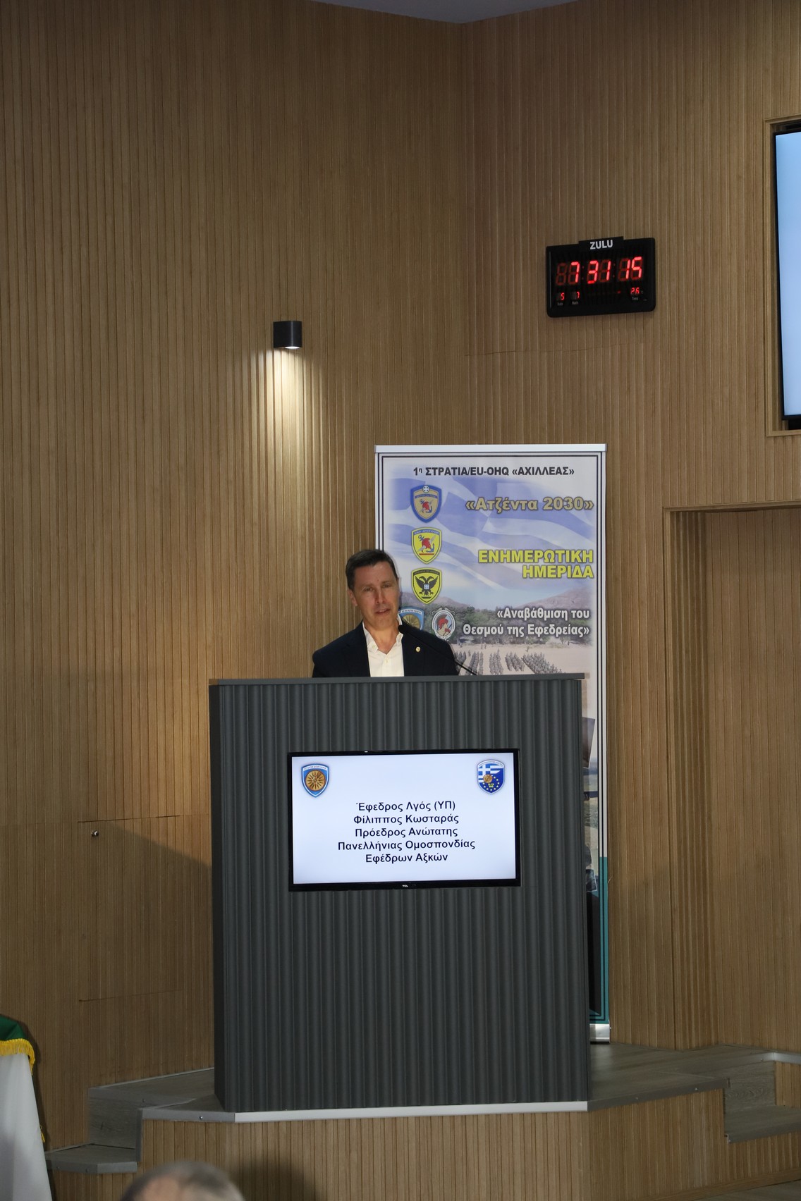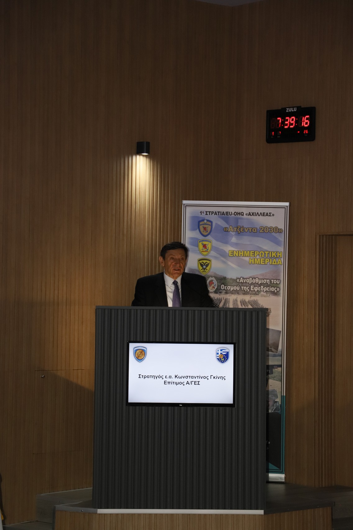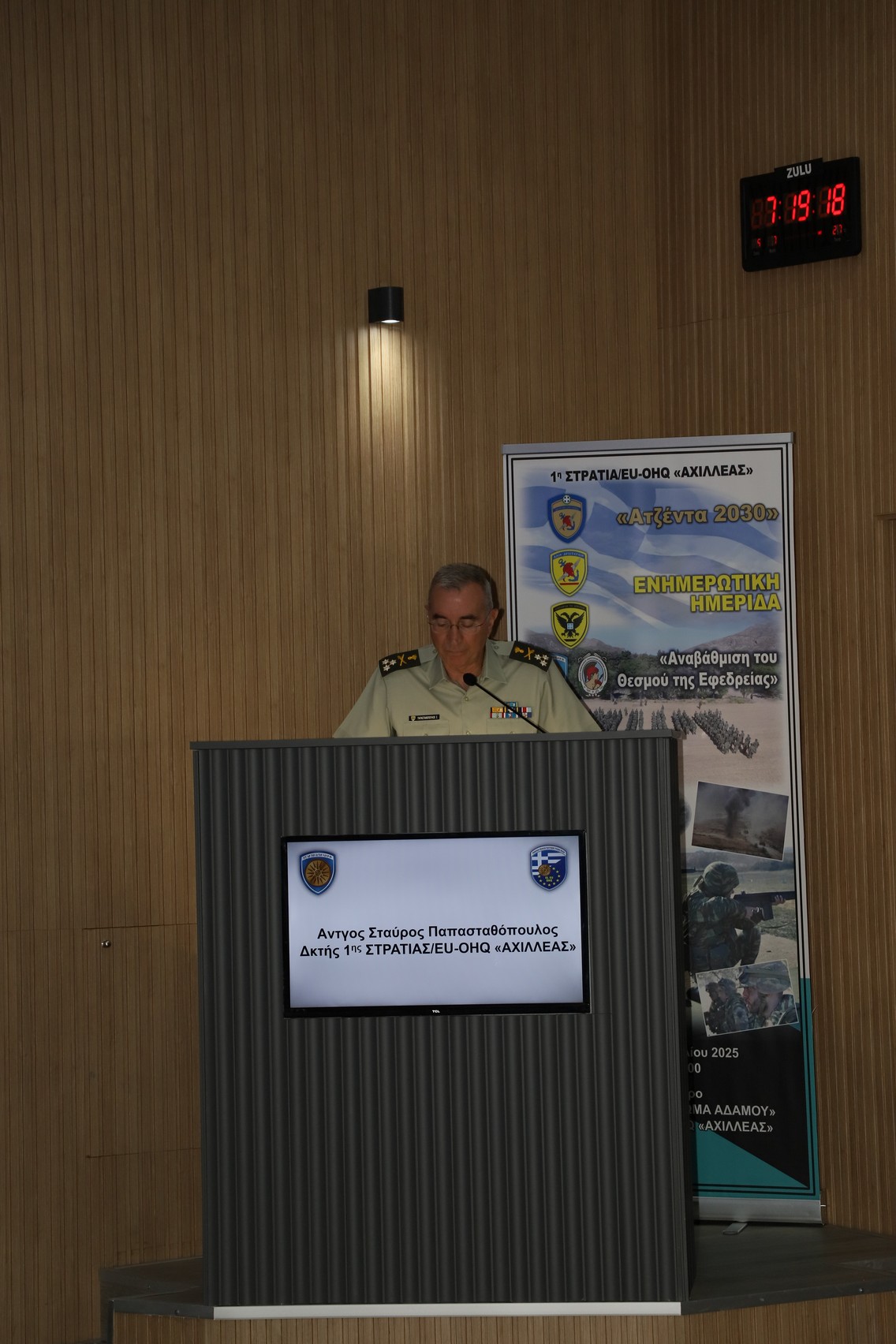 Το Σάββατο 05 Ιουλίου 2025, στο πλαίσιο της αναβάθμισης του θεσμού της εφεδρείας, πραγματοποιήθηκε στο Αμφιθέατρο «ΑΝΤΙΣΤΡΑΤΗΓΟΥ ΘΩΜΑ ΑΔΑΜΟΥ» στην έδρα της 1ης ΣΤΡΑΤΙΑΣ/EU-OHQ «ΑΧΙΛΛΕΑΣ», ημερίδα με θέμα «Αναβάθμιση του Θεσμού της Εφεδρείας».