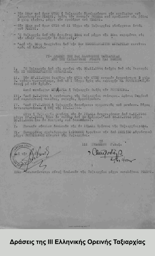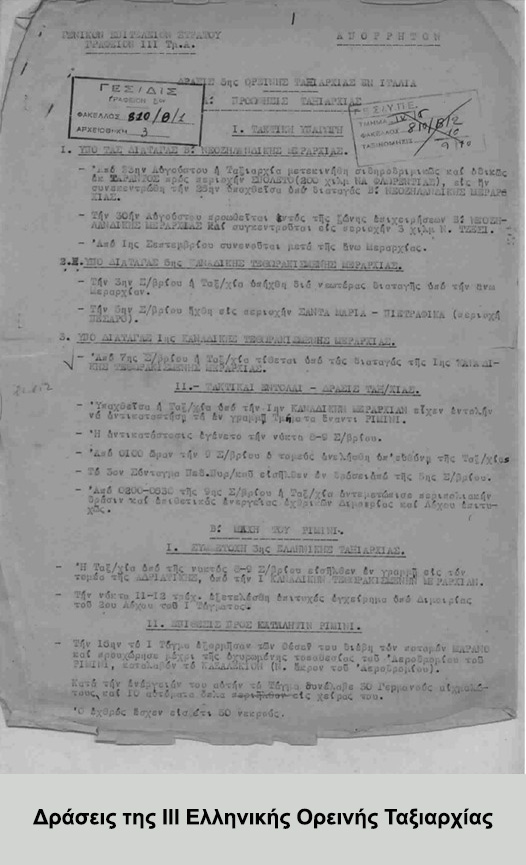 Η ΙΙΙ Ελληνική Ορεινή Ταξιαρχία (ΙΙΙ ΕΟΤ), όπως ονομάστηκε, συγκροτήθηκε στον Λίβανο, στις 9 Ιουνίου 1944, με διοικητή τον Συνταγματάρχη Θρασύβουλο Τσακαλώτο με σκοπό τη μεταφορά της στην Ιταλία, στο πλευρό των συμμαχικών δυνάμεων. Οι συμμαχικές επιχειρήσεις είχαν ως σκοπό τη διάσπαση της «Γοτθικής Γραμμής» και την κατάληψη της πόλης του Ρίμινι, η οποία θεωρούνταν σημείο στρατηγικής σημασίας λόγω της γεωγραφικής θέσης και των συγκοινωνιακών οδών.