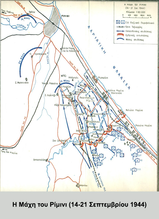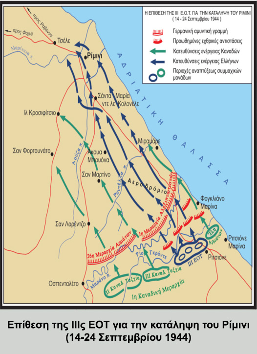 Την επίθεση εναντίον του Ρίμινι ανέλαβε η 1η Καναδική Μεραρχία στην οποία υπαγόταν η ΙΙΙ ΕΟΤ. Η Ταξιαρχία διατάχθηκε με τα τρία τάγματά της να εκτοξεύσει νυχτερινή επίθεση για την κατάληψη της πόλης. Παρά την γερμανική αντίσταση, τα ελληνικά τμήματα κατέλαβαν το αεροδρόμιο του Ρίμινι και στις 19 Σεπτεμβρίου κατευθύνθηκαν μαζί με τα καναδικά τμήματα προς την πόλη. Μετά την εξουδετέρωση κάθε τοπικής αντίστασης των Γερμανών, τριμελής επιτροπή του αντιφασιστικού κόμματος παρέδωσε άνευ όρων την πόλη στα ελληνικά τμήματα υπογράφοντας στις 21 Σεπτεμβρίου επίσημο πρωτόκολλο.