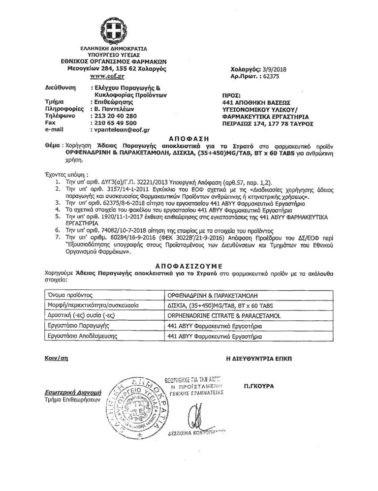Στο πλαίσιο της μέριμνας για το προσωπικό, το Γενικό Επιτελείο Στρατού σχεδιάζει και υλοποιεί δράσεις με σκοπό την αναβάθμιση της παροχής υπηρεσιών υγείας στο ανθρώπινο δυναμικό του. Υπόδειγμα καινοτομίας, υψηλού επαγγελματισμού και εξειδικευμένης επιστημονικής κατάρτισης του προσωπικού της 441 Αποθήκης Βάσης Υγειονομικού Υλικού (441 ΑΒΥΥ), είναι η παρασκευή του νέου προϊόντος «ΟΡΦΕΝΑΔΡΙΝΗ και ΠΑΡΑΚΕΤΑΜΟΛΗ».